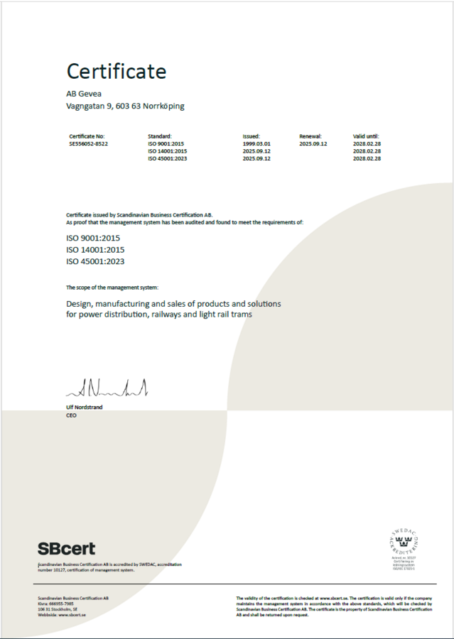GEVEA offers leading products, solutions and services in disconnector and fuse technology, electricity distribution and materials for the railway that meet or exceed our customers' requirements regarding function, documentation, quality, environmental impact and energy consumption. Through their professional knowledge, experience and commitment, all employees contribute to our deliveries meeting our customers' expectations and requirements. We work continuously to reduce our environmental impact. We do this by working in a way that promotes reduced energy use, reduced amount of chemical substances and materials and minimizes our waste. Continuous improvement is a natural part of our everyday lives.